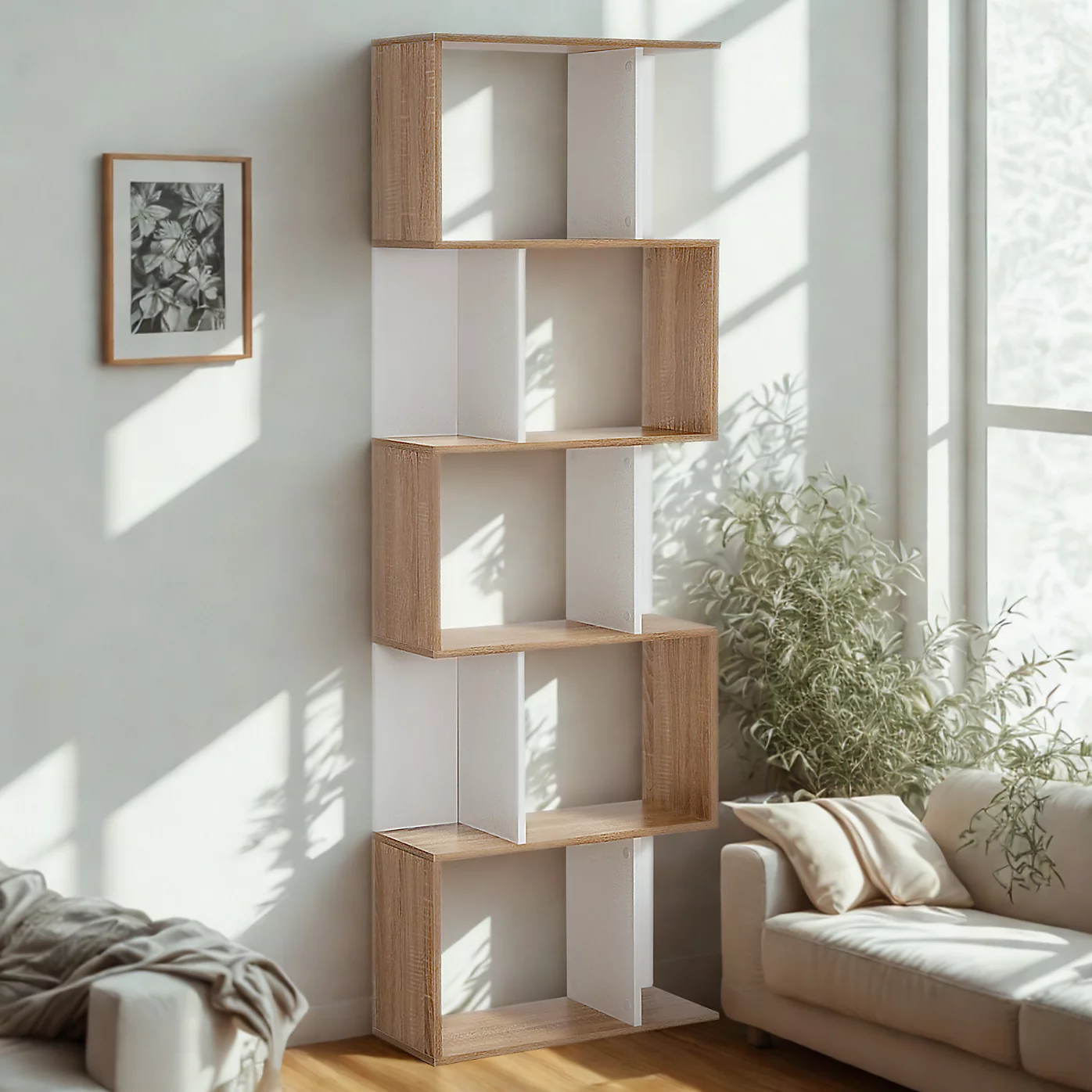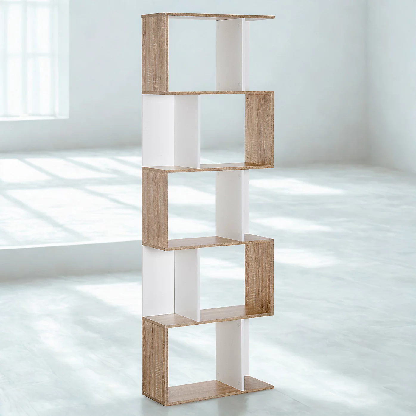 Add some funky style to your space with this bookcase. This case is available in white and oak brown color. Made of high-quality manufactured wood. The five tier shelves are stacked on top of one another, and each one is placed off the center line to create an uneven zigzag silhouette. But have no fear, this bookshelf is stable and will have no problem displaying your favorite books and photos.