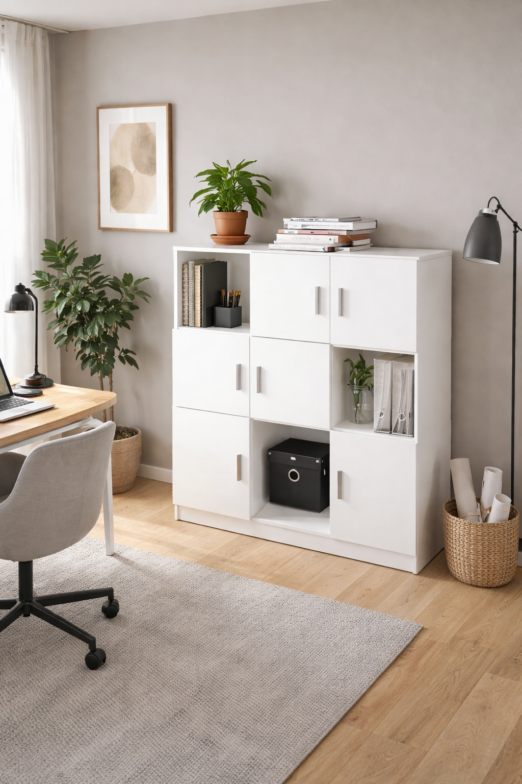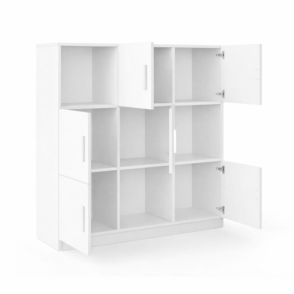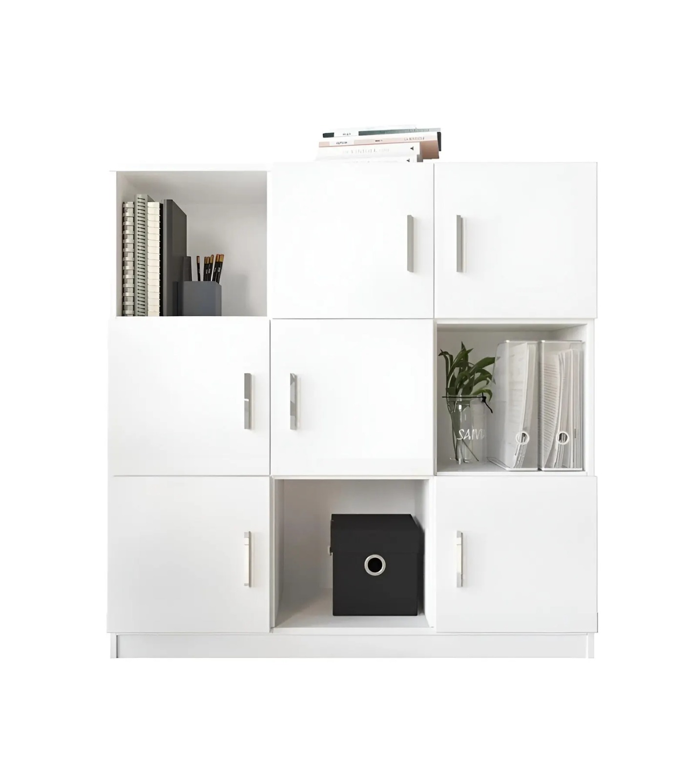 The IRIS Office Storage Shelf is designed to provide organized storage with a clean, modern aesthetic suited for contemporary interiors. Crafted from durable engineered wood, this unit features a crisp white finish that blends seamlessly into home offices, study areas, or living spaces while maintaining a bright and minimal look. Its structured grid-style layout combines open cubbies and closed cabinet compartments, allowing you to display books, décor pieces, and everyday essentials while keeping other items neatly concealed. The balanced arrangement of shelving creates a visually organized storage solution that works equally well for office supplies, documents, or decorative objects. Finished with sleek silver handles for a subtle modern accent, the article offers both practicality and refined simplicity for versatile home storage.