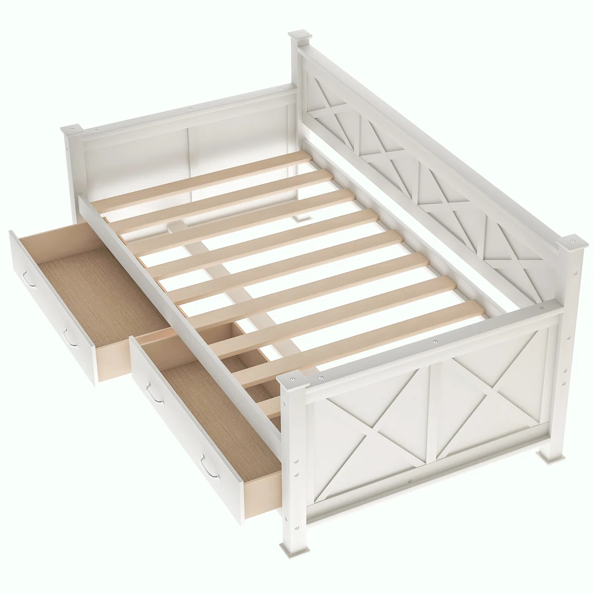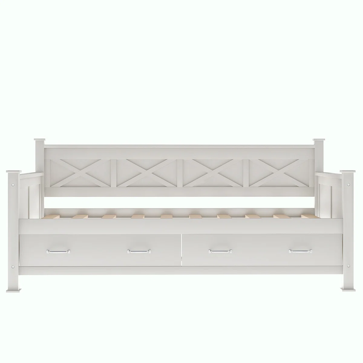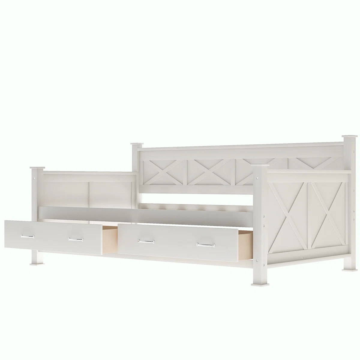 This daybed with drawers strikes a balance between tailored farmhouse design with modern queues to your guest room. The mattress is not included. It’s available in the white deco paint finish and crafted from solid and synthetic wood. Featuring two drawers under the daybed for extra storage. Easy to open four drawer handles provided. The ‘X’ frame panel surface creates texture and interest in the straight-line silhouette. Two lower drawers provide perfect storage space for your guest’s bedding and accessories.