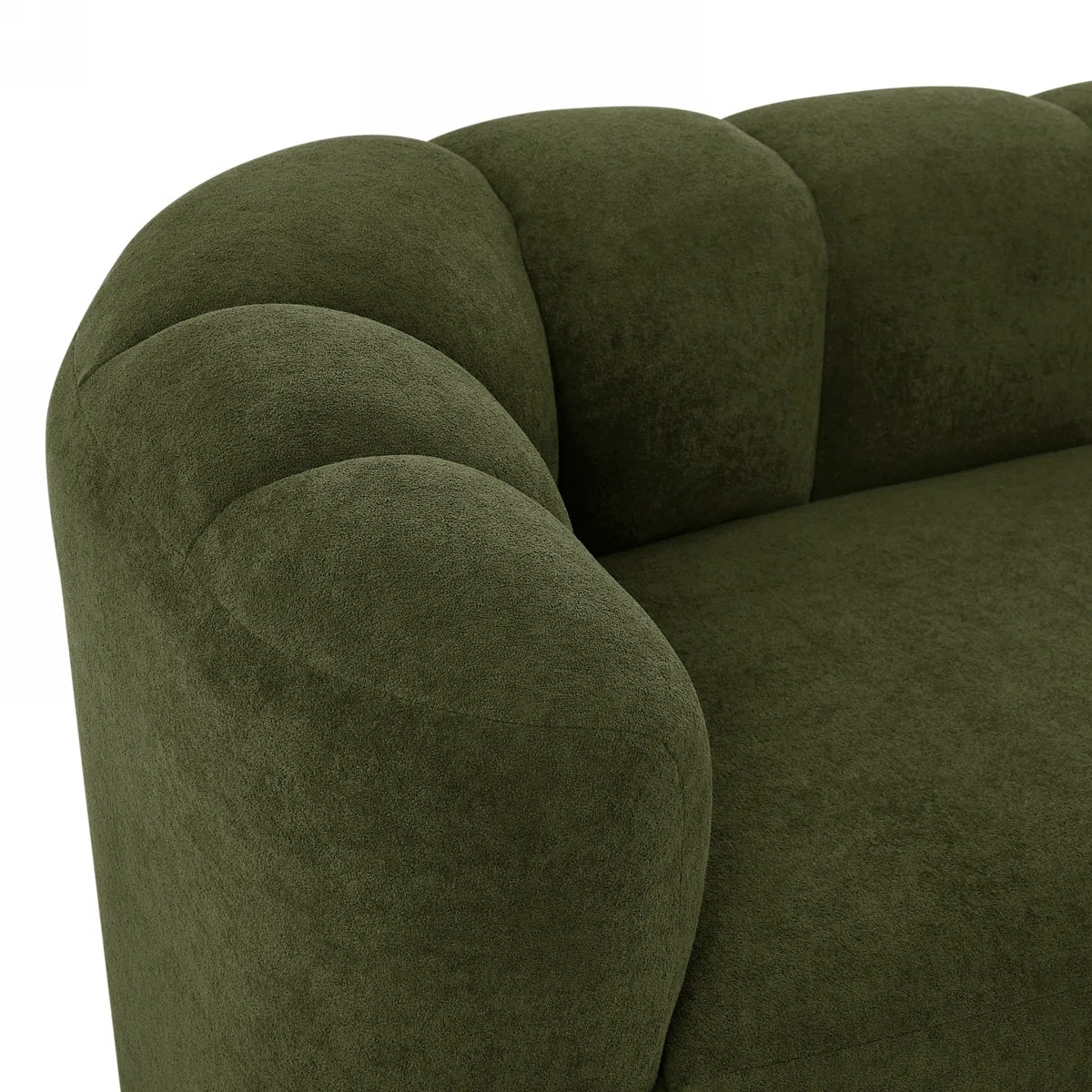 Upholstered in textured olive green bouclE fabric for a warm, tactile finish