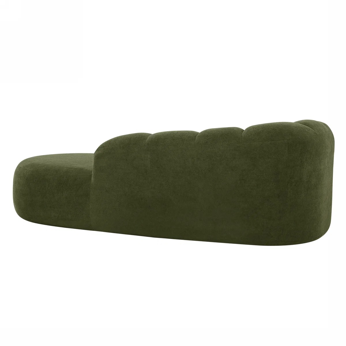 The OLLE chaise lounge combines sculptural comfort with a bold modern presence. Built with a solid and engineered wood structure, it offers dependable support while maintaining a soft, rounded silhouette. Upholstered in olive green bouclé fabric, it brings rich texture, warmth, and a refined natural tone to contemporary interiors. Its curved channel-style back and side panels create a cozy enclosed feel, while the extended low-profile seat provides generous space for lounging, reading, or relaxing. Designed as both a comfort piece and a visual accent, OLLE is ideal for living rooms, bedrooms, and stylish reading corners.