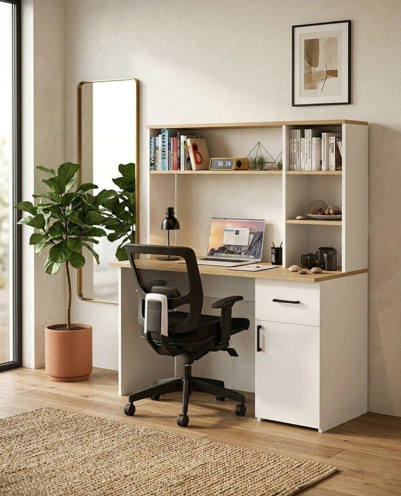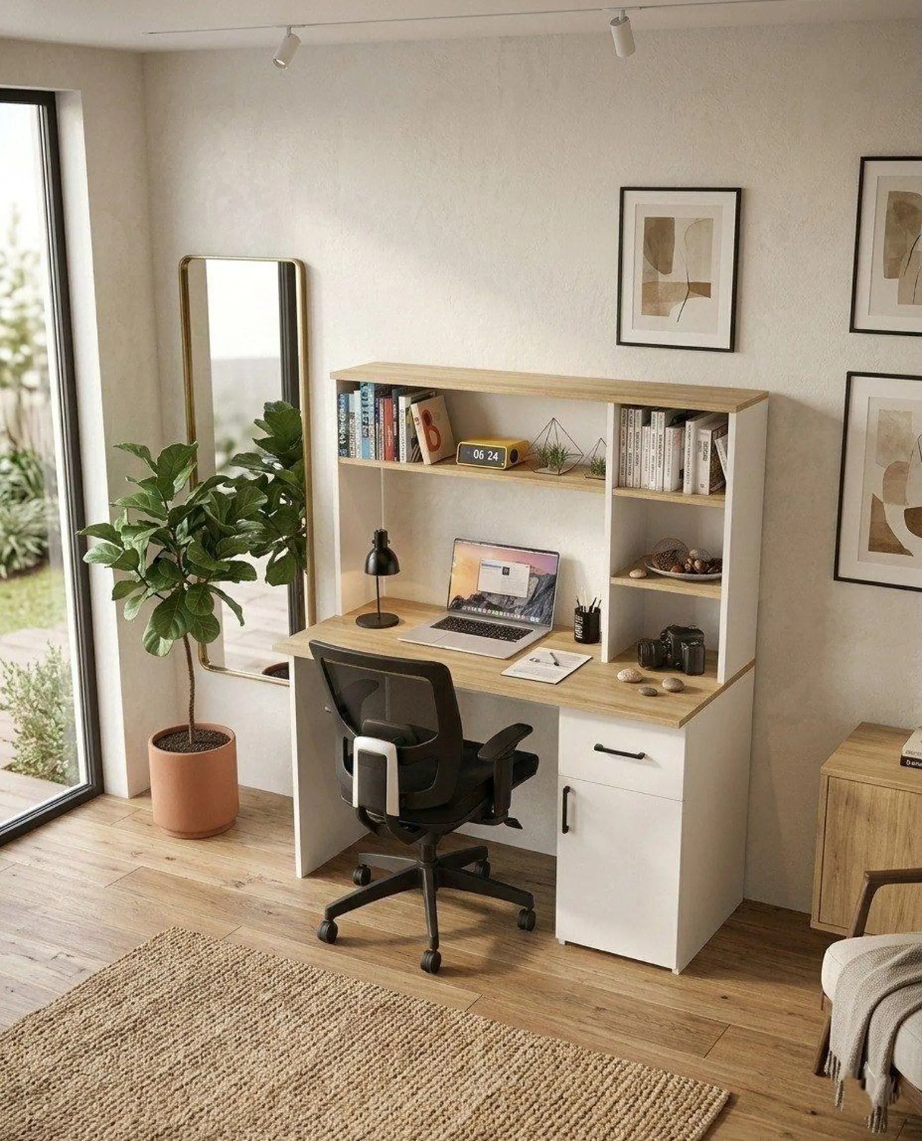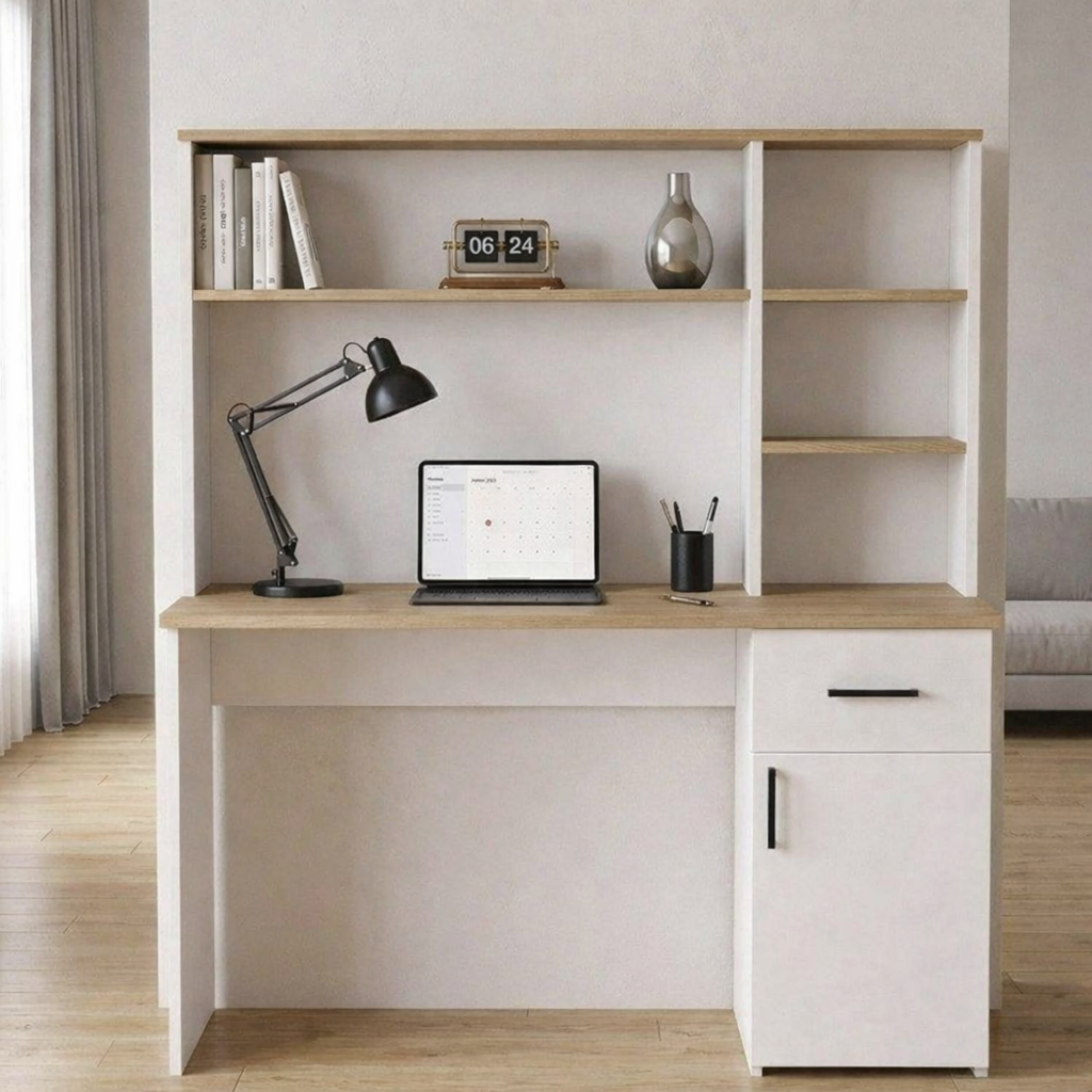 The OPOC Writing Desk with Bookshelf is designed to combine practical workspace functionality with clean modern styling. Crafted from durable engineered wood, this desk features a contemporary two-tone finish in white and oak brown that creates a bright, balanced aesthetic suited for modern interiors. The spacious desktop provides a comfortable surface for laptops, writing, and daily tasks, making it an ideal workstation for home offices, study areas, or bedrooms. An integrated upper bookshelf adds vertical storage without increasing the overall footprint, offering convenient space for books, décor pieces, and office supplies. On the side, a drawer and enclosed cabinet provide additional storage to keep everyday essentials organized and out of sight. Finished with sleek black handles for a subtle modern accent, the OPOC desk blends smart storage with a streamlined design creating a functional and visually clean workspace solution for contemporary homes.