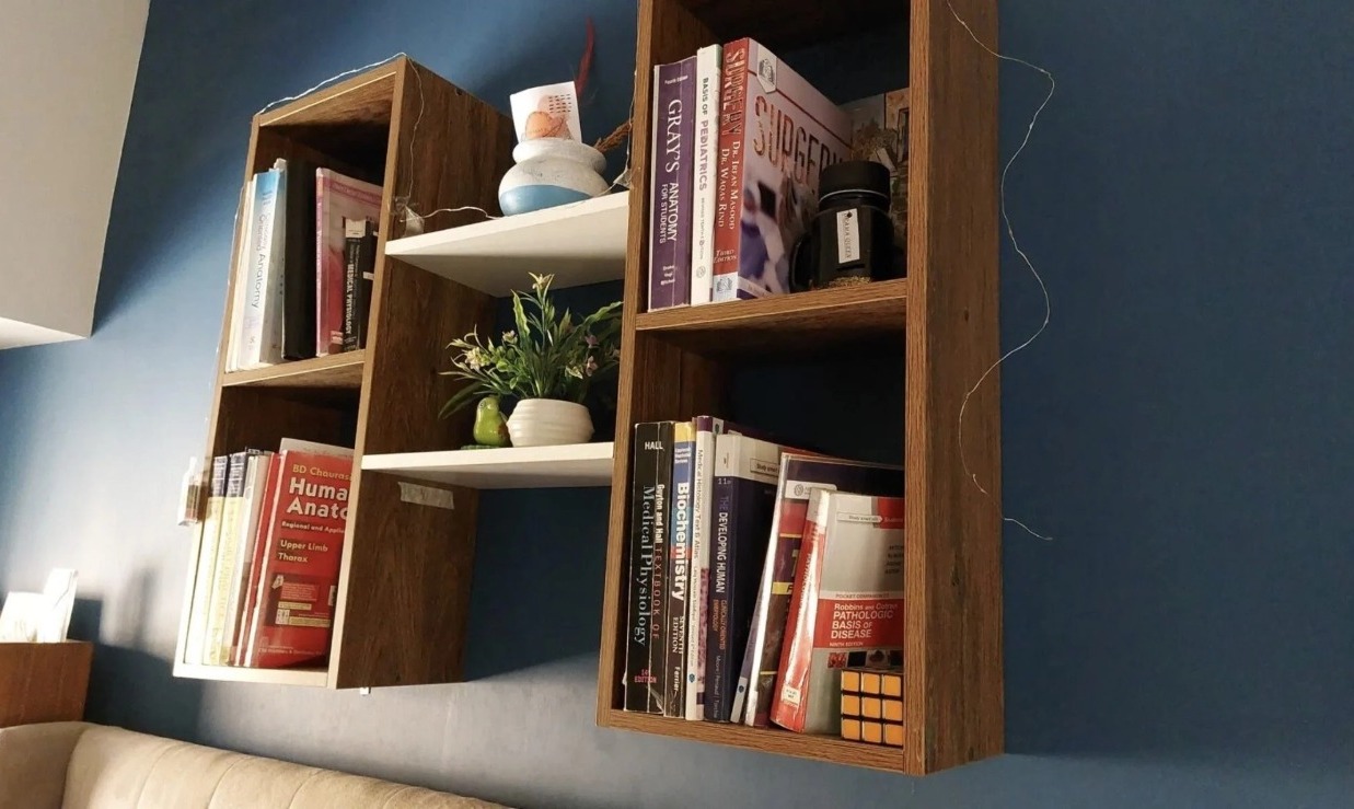 With its symmetrical and open back, this leaning bookcase brings a dash of contemporary style as it provides a place to stage any accent pieces. Crafted from synthetic wood. This piece features four vertical shelves and one horizontal shelf in the center. It offers plenty of space so you can put books, framed photos, potted plants, and beyond. A two-toned white and walnut finish outfits this design to create contrast.