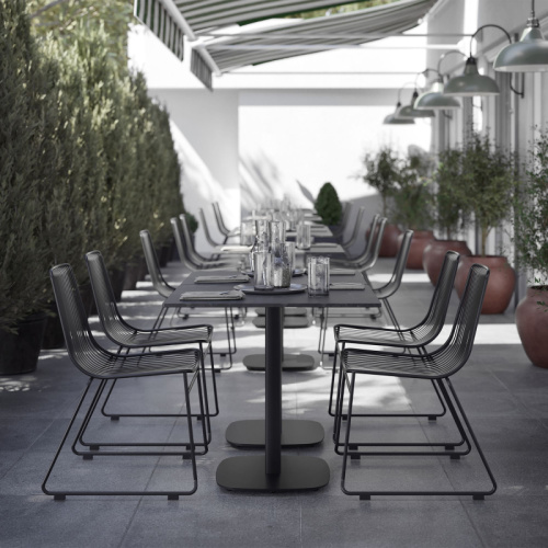 A visually simple aesthetic is provided by this outdoor furniture piece. The choice of materials and design enables it to seamlessly blend into various settings, whether it be a natural landscape or an urban environment. The intention behind the design is not only to serve its practical purpose but also to add grace. Overall a table that provides a sleek and contemporary appearance. Suitable for cafes, restaurants, gardens, terraces, and balconies.